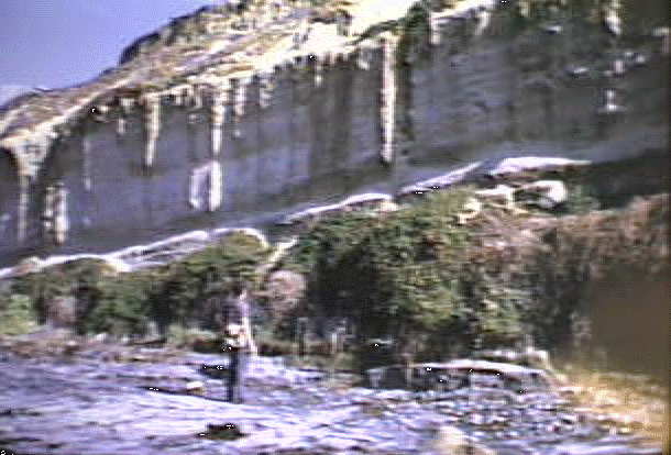 | All along the cliffs seepage of ground water may be seen. The water perculates downward until impearmeable rock layers are incountered. The water then migrates to the cliff, where it seeps out. | ![]() |